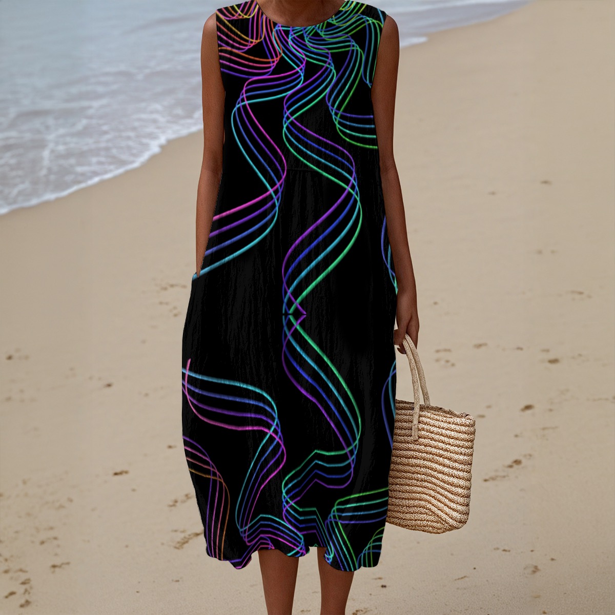 Chic and breezy, this sleeveless summer dress is the perfect blend of comfort and casual elegance. Made from textured cotton slub, it feels lightweight yet is more wrinkle-resistant and easy to care for. The loose silhouette and soft drape make it perfect for warm weather, trips to the beach, or weekend strolls. The sleeveless design and crew neckline create a clean, modern look. Whether paired with sandals and a straw bag or worn barefoot on the beach, this versatile piece will be a must-have in your summer wardrobe.