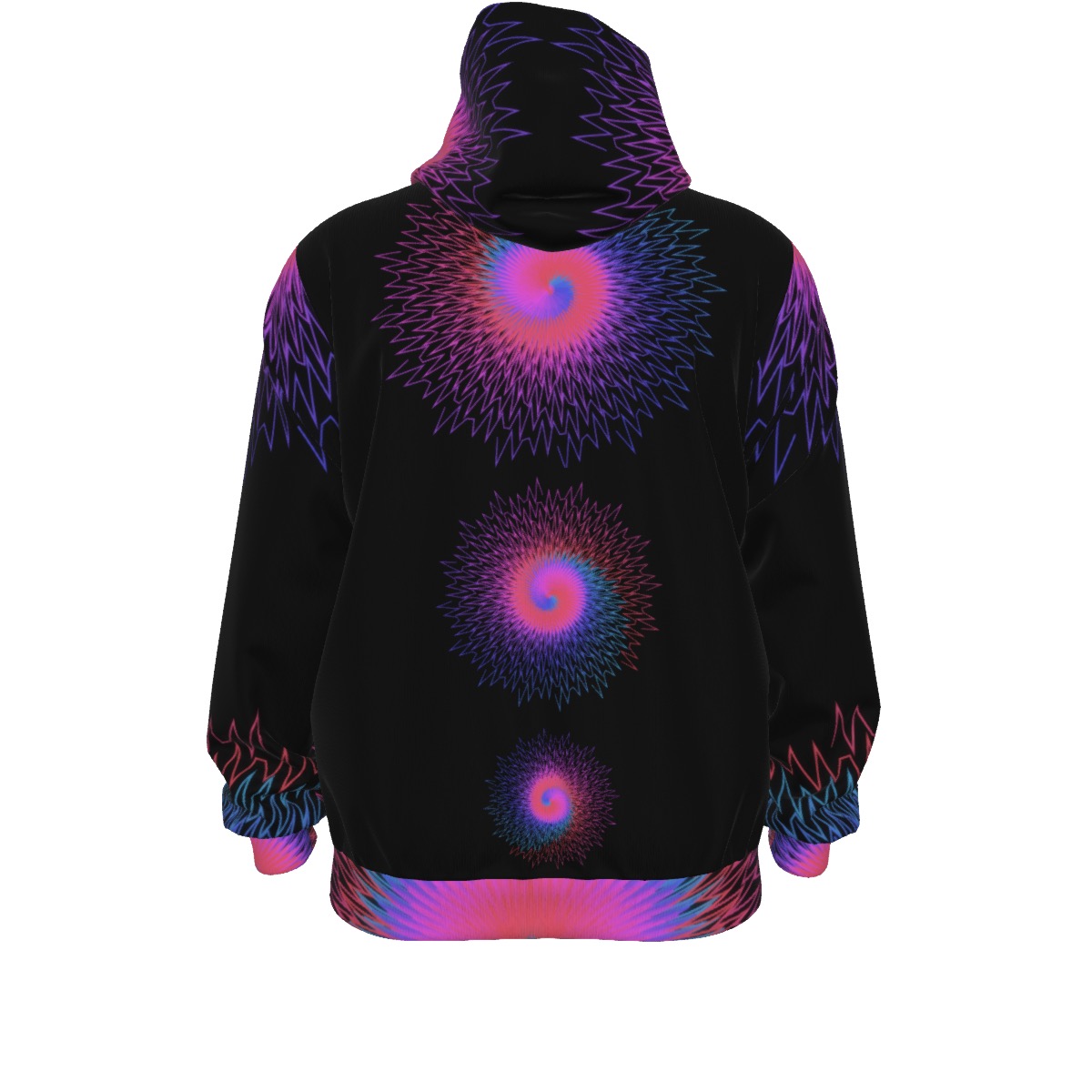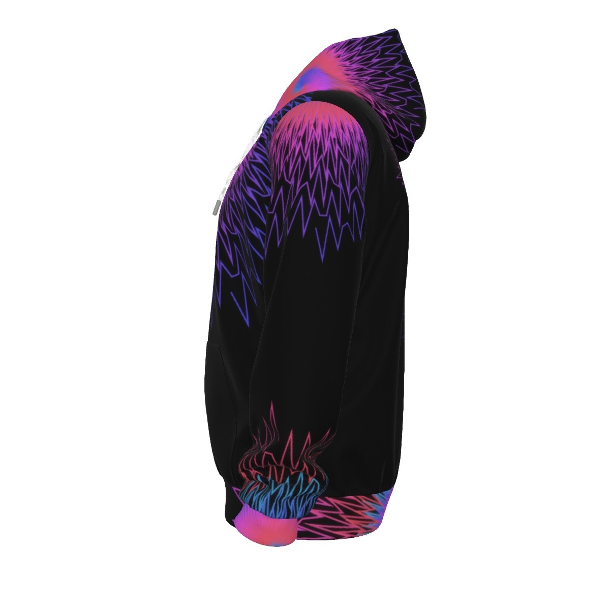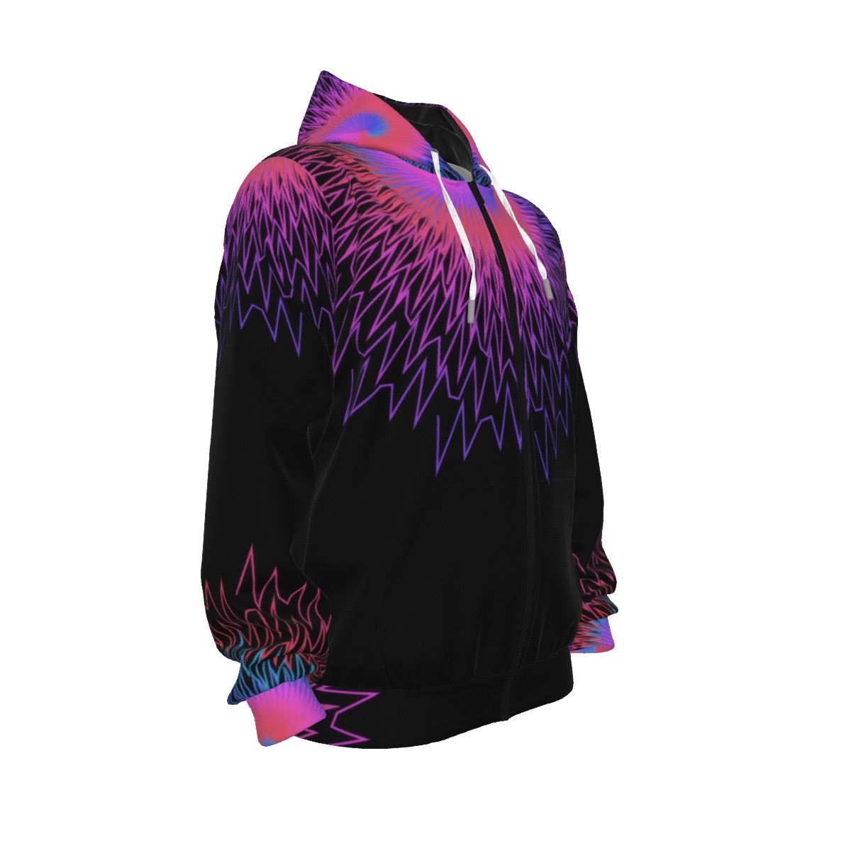 Crystalline mathematics explode from the crown chakra in radiant purples and magentas. Sharp geometric shards cascade downward like frozen lightning – sacred geometry meets shamanic vision. This is power dressing for consciousness explorers. Wear your inner light on the outside.