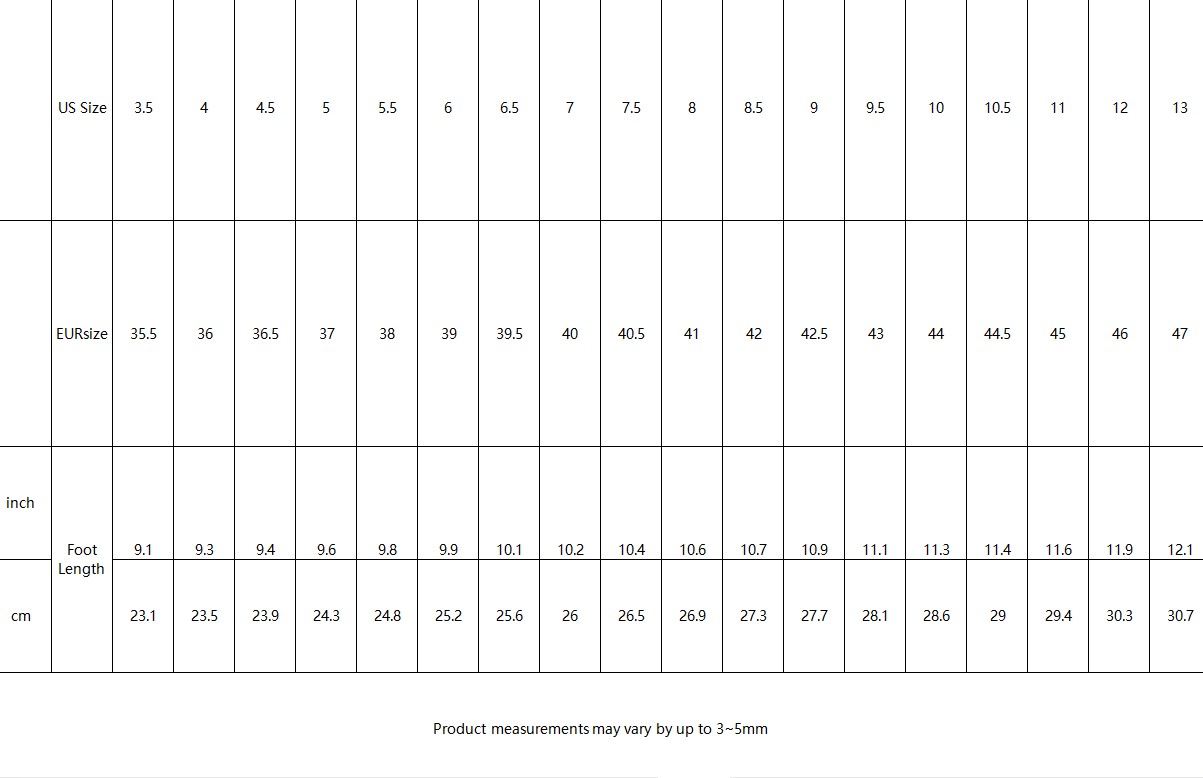 | EUR Size | US Size | Insole Length(inch) | Insole Length(mm) |